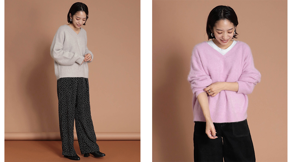 Vカットのラインも主役級のトップスでボトムがシンプルでも映える一枚です。