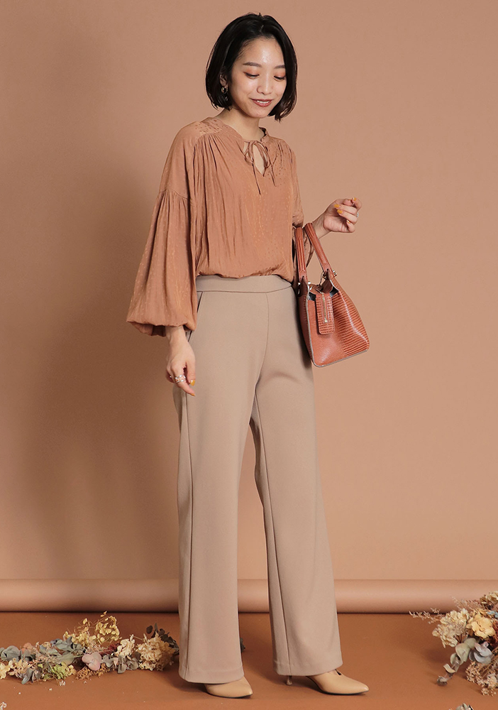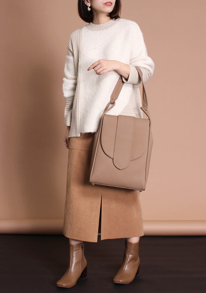 セットアップでフェミニン、スカート+ゆるめのトップスでリラックス感のある雰囲気に。パンツ合わせでオフィススタイルにも最適です。