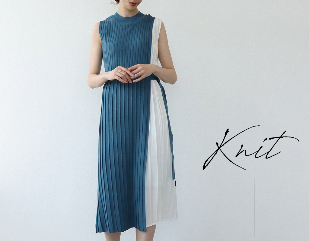 ノースリーブハイネックイレギュラープリーツニットワンピース