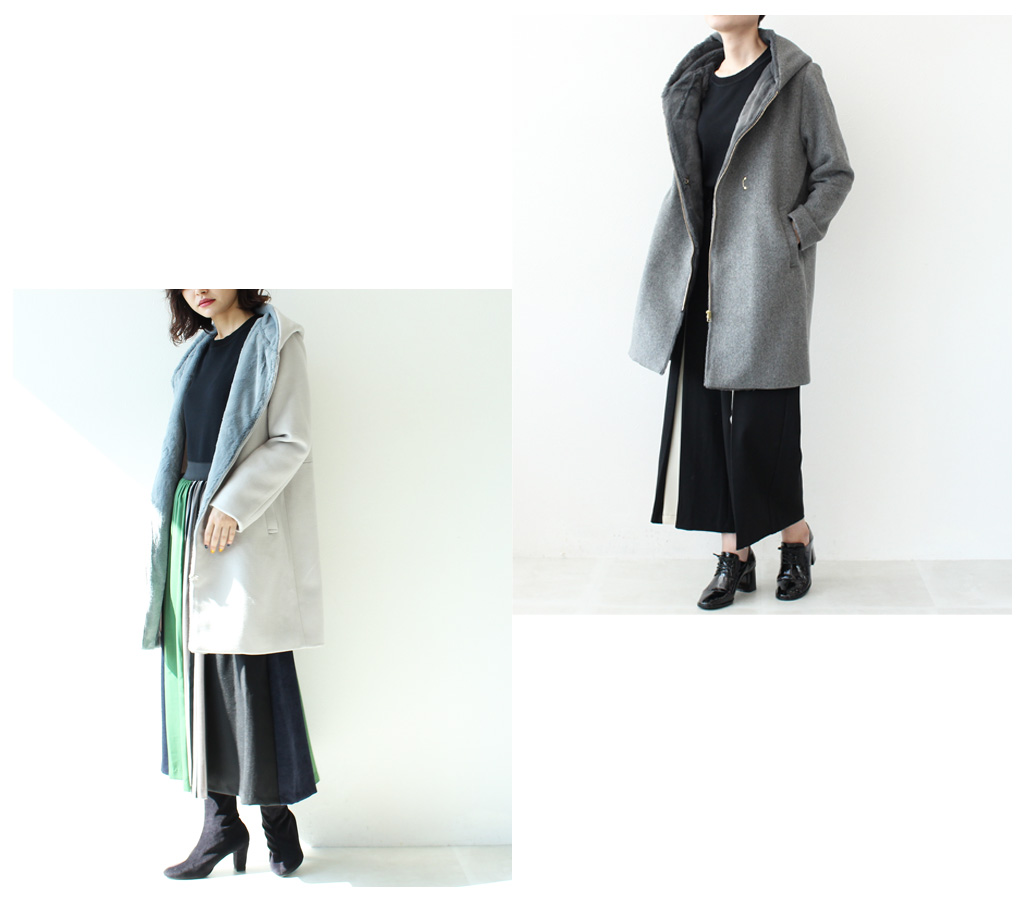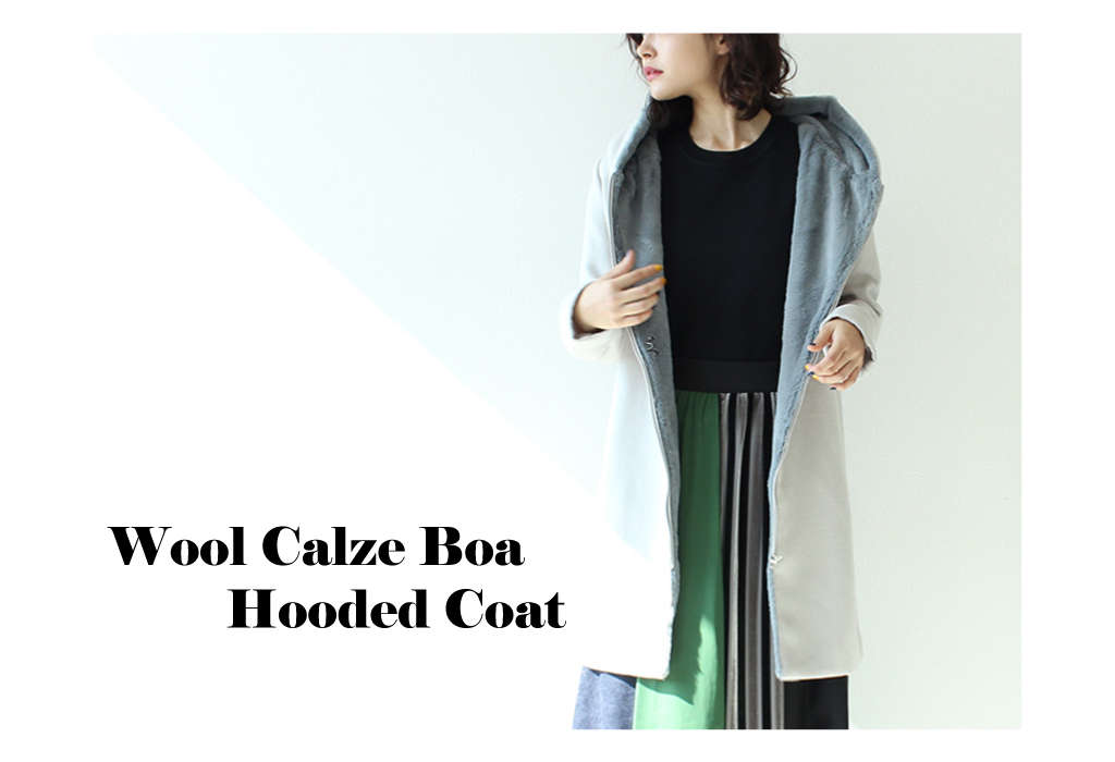 ウールカルゼ調の表情のある素材感が特徴のボアフードコート。