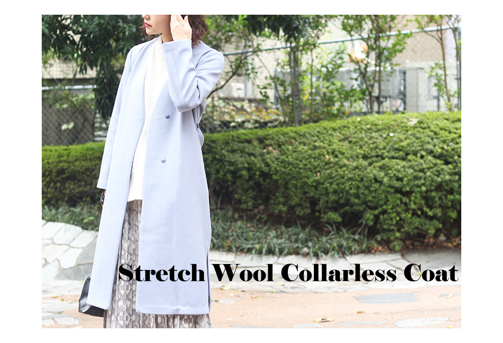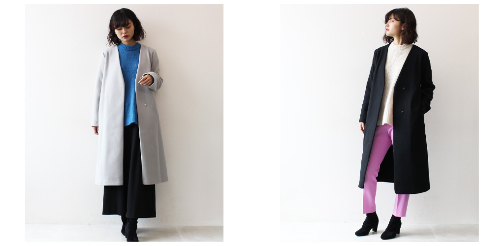 襟がないコートはアクセサリーやスカーフなどオシャレが引き立ちます。