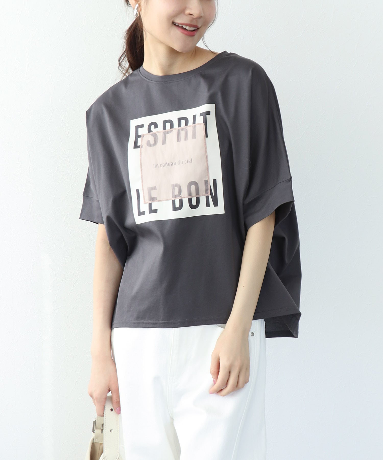 フロントのロゴにオーガンジーを重ねることで、奥行きのある表情とさりげない華やかさをプラス。