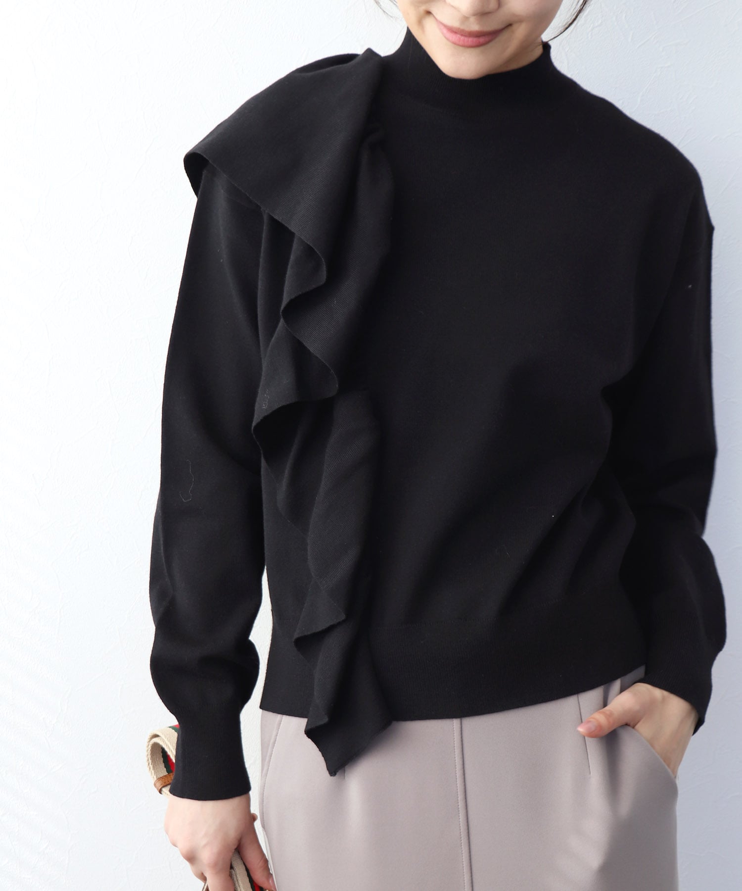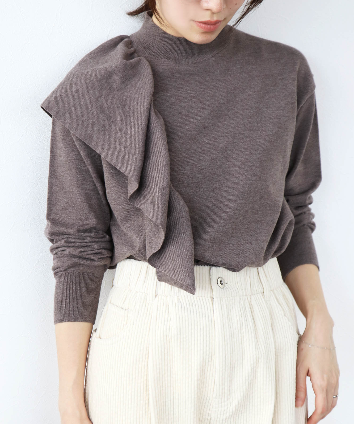 ショルダー部分に華やかなラッフルをあしらい、1枚でフェミニンな存在感を放つ「ショルダーラッフルプルオーバー」。