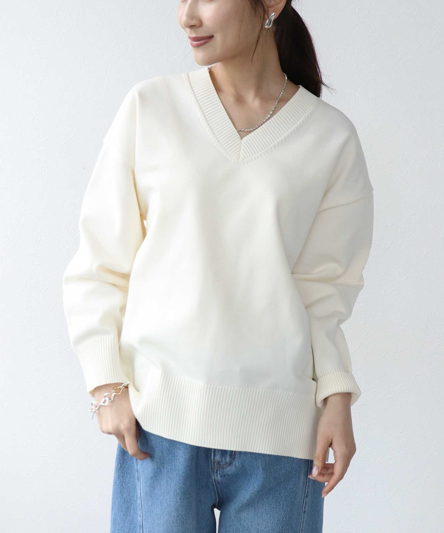 程よく開いたVネックが顔まわりをすっきりと見せ、抜け感のある印象に仕上げます。
