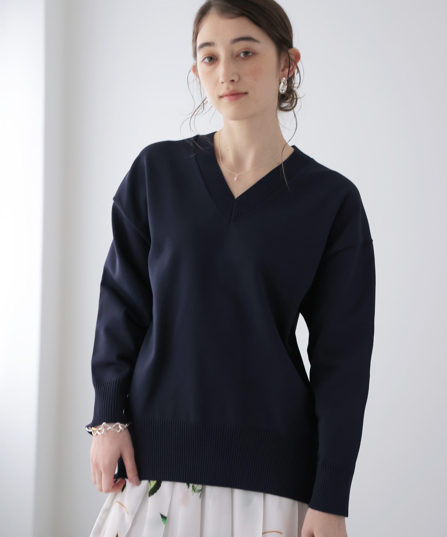 シンプルな中に美しいシルエットが際立つ、Vネックデザインのベーシックニット。
