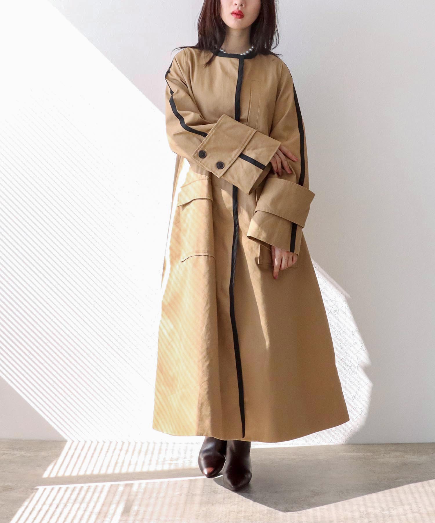 • ワイドスリーブノーカラーロングコート