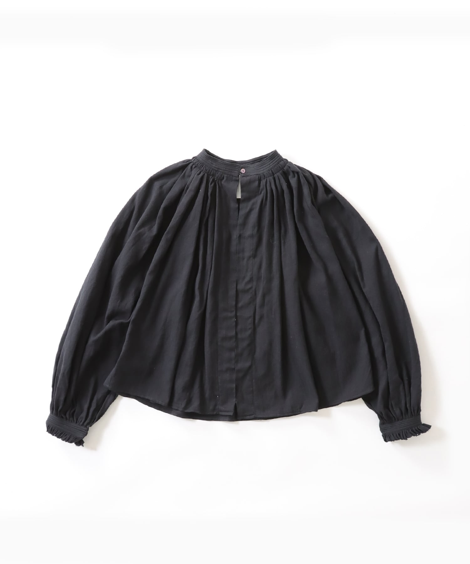 ギャザーを贅沢に襟ぐりと袖口に入れ、ボリュームのあるフォルムに仕上げたブラウス。