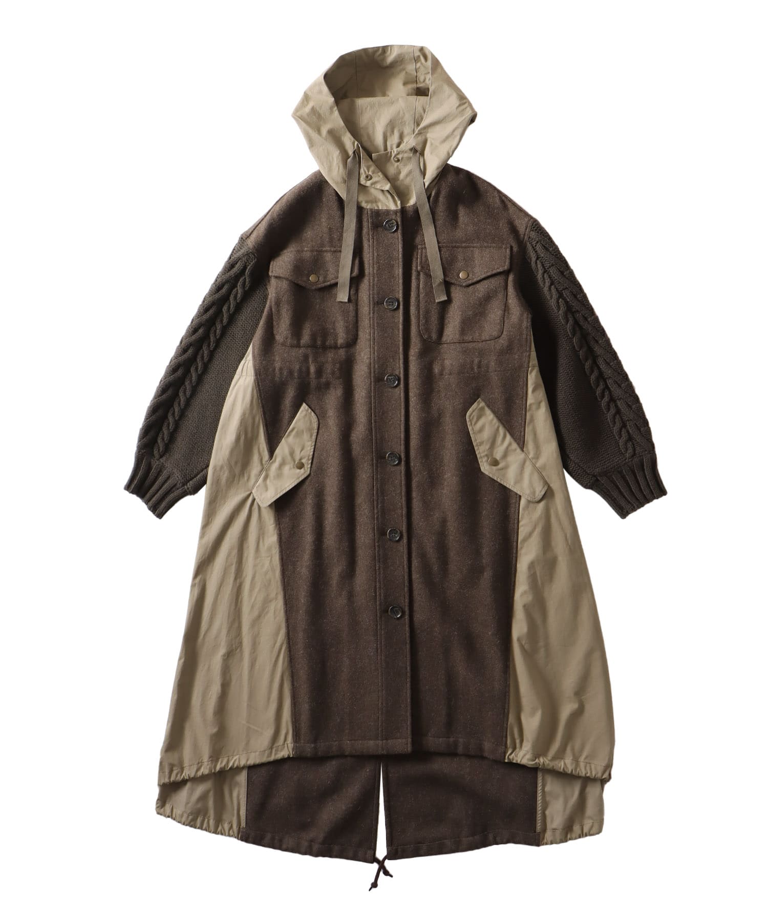 袖はバルキー感のあるケーブル編みしたニットに切り替え、贅沢にドッキングしたコートです。