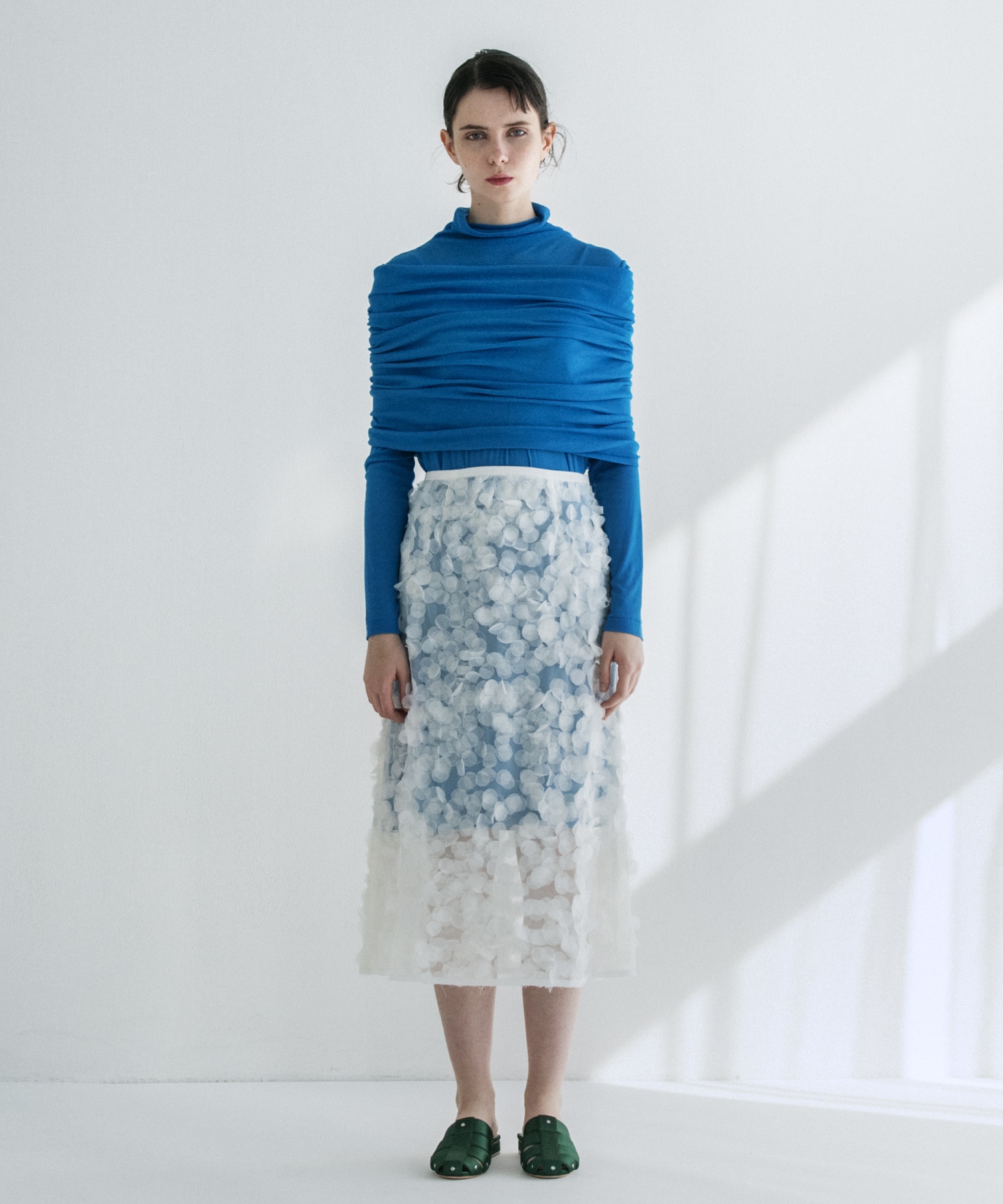 スヌードのようなパーツが付属で付いており肩回りに通してギャザーを寄せると、オフショルダーのような見え方で着用が可能。