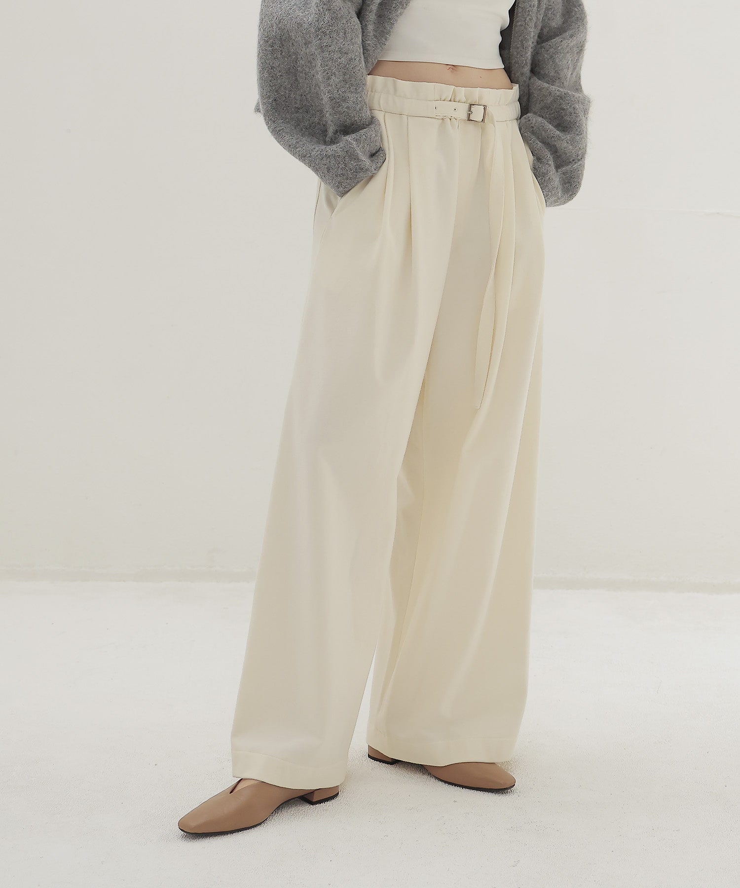 共布ベルトでウエストまわりにきちんと感をプラスし、ペーパーバッグデザインがインでもアウトでもバランス良く決まる一本。