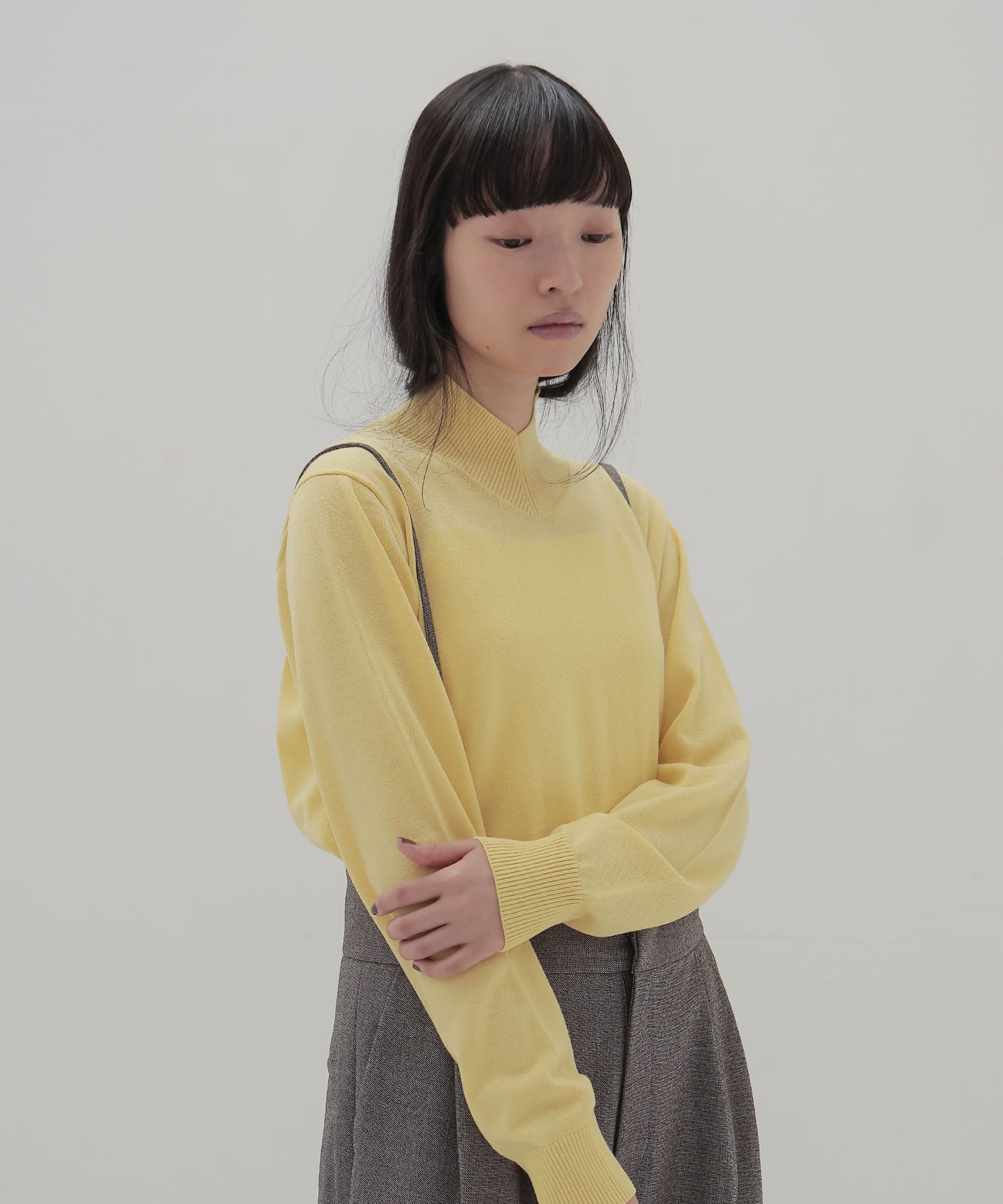 Vネックとハイネックを掛け合わせた独特の衿デザインが、ミニマルな中にシャープな印象をプラス。