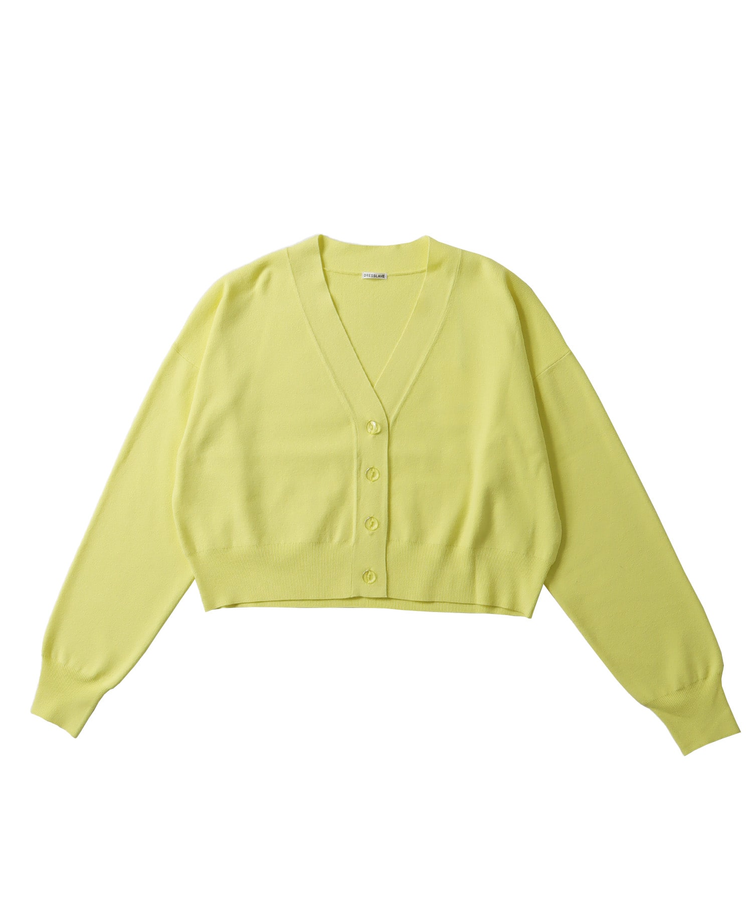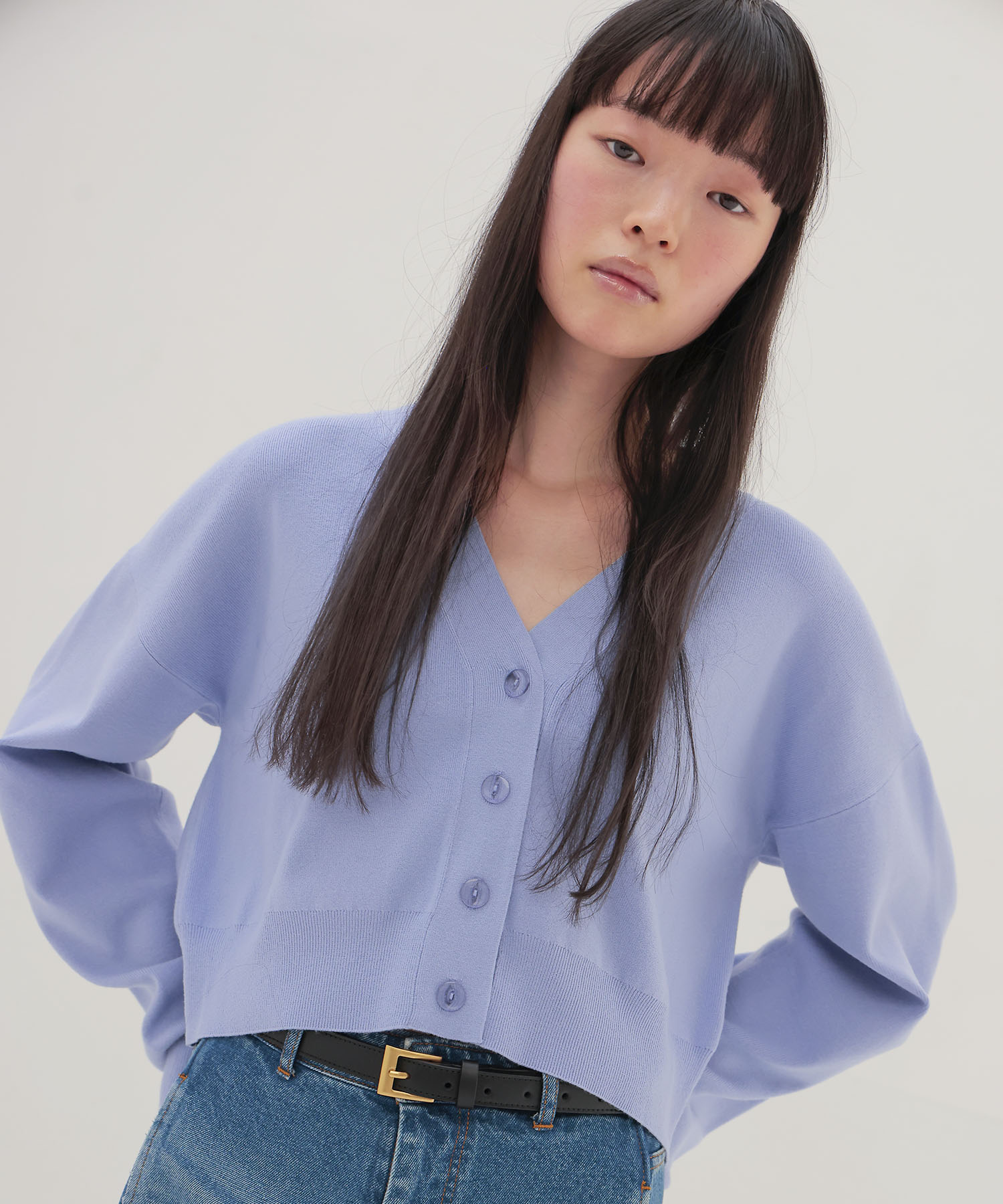コンパクトなVネックのショート丈は、ボタンを留めてプルオーバー感覚での着用もおすすめ。
