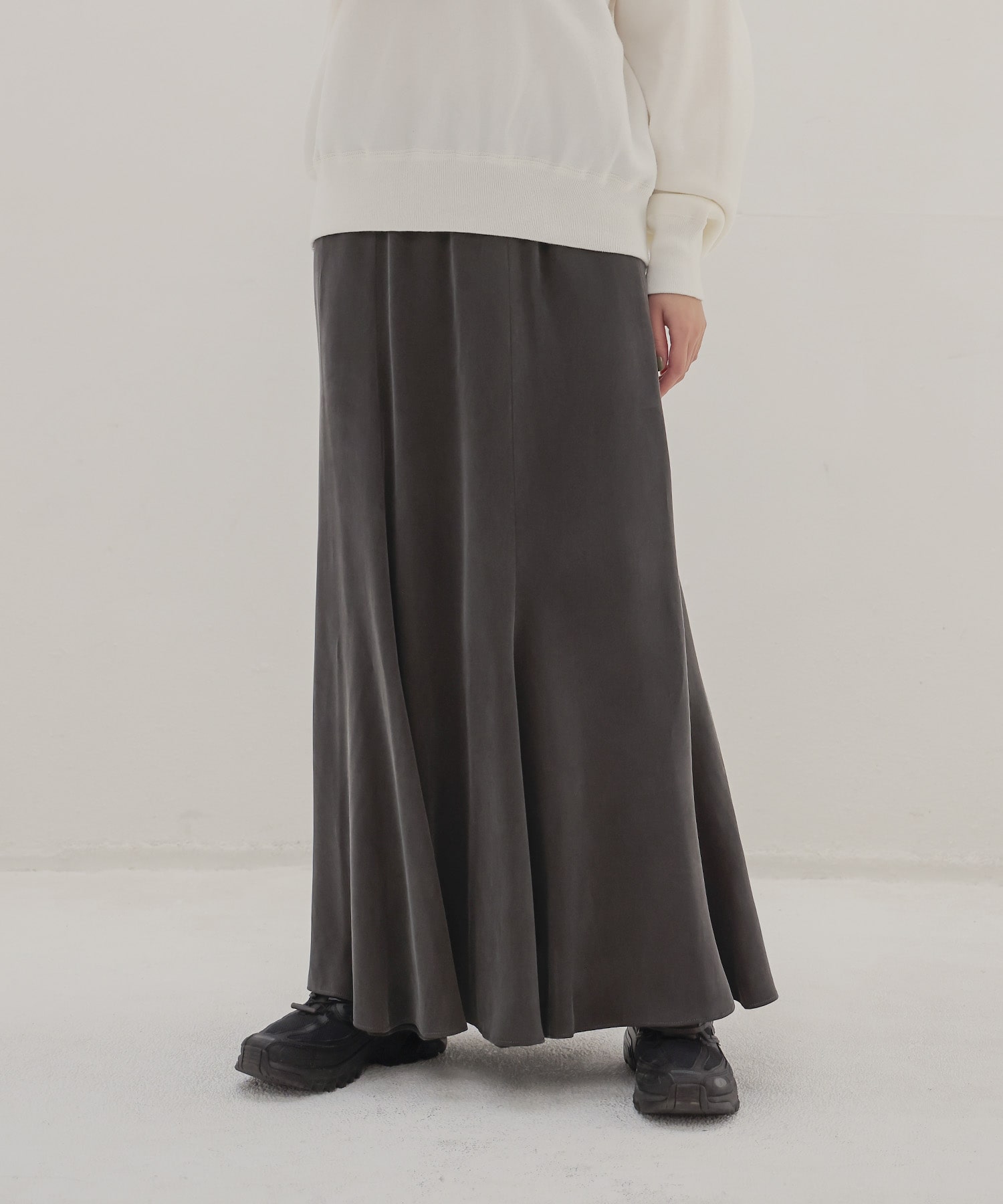 落ち感のある素材が動くたびにしなやかに揺れ、スタイリングに洗練された印象をプラス。